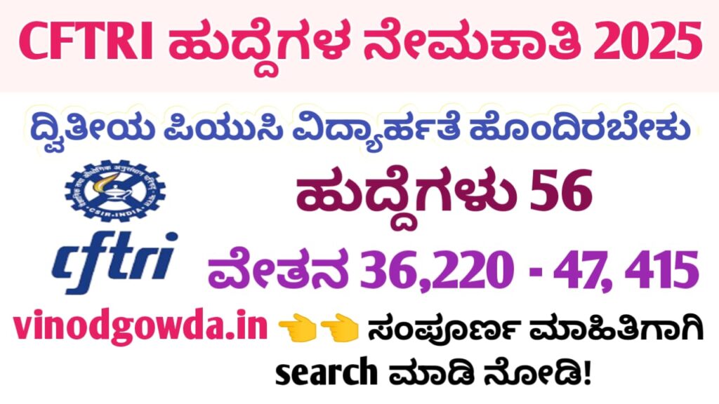 CFTRI Recruitment 2025 : ಕೇಂದ್ರೀಯ ಆಹಾರ ತಂತ್ರಜ್ಞಾನ ಸಂಶೋಧನಾಲಯ, ಮೈಸೂರು ಇದರಲ್ಲಿ ಅಗತ್ಯ ಇರುವ ಜೂನಿಯರ್ ಸೆಕ್ರೆಟರಿಯೆಟ್ ಅಸಿಸ್ಟಂಟ್ ಹಾಗೂ ಜೂನಿಯರ್ ಸ್ಟೆನೋಗ್ರಾಫರ್ ಹುದ್ದೆಗಳ ಭರ್ತಿಗೆ ಅರ್ಹ