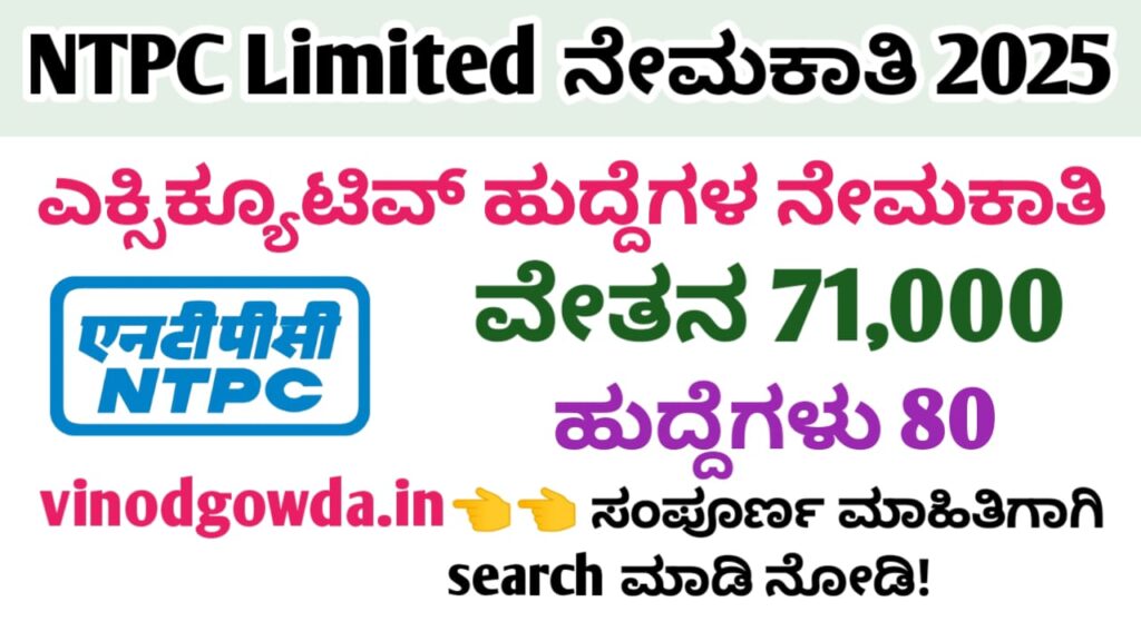 NTPC Limited Recruitment 2025 : ನ್ಯಾಷನಲ್ ಥರ್ಮಲ್ ಪವರ್ ಕಾರ್ಪೊರೇಷನ್ ಲಿಮಿಟೆಡ್ ನಲ್ಲಿ ಅಗತ್ಯವಿರುವ ಎಕ್ಸಿಕ್ಯೂಟಿವ್ (ಹಾಸ್ಪಿಟಲ್ ಅಡ್ಮಿನಿಸ್ಟ್ರೇಷನ್) ಹುದ್ದೆಗಳ ಭರ್ತಿಗೆ ಅರ್ಹ ಹಾಗೂ ಆಸಕ್ತ ಅಭ್ಯರ್ಥಿಗಳಿಂದ