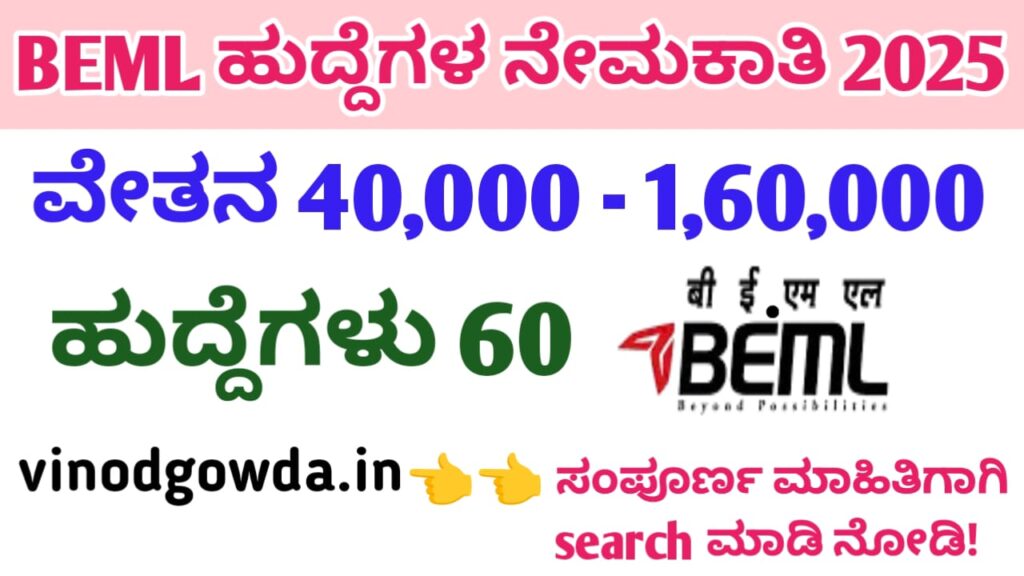 BEML Officer Recruitment 2025 : ಭಾರತ್ ಅರ್ಥ್ ಮೂವರ್ಸ್ ಲಿಮಿಟೆಡ್ನಲ್ಲಿ ಅಗತ್ಯವಿರುವ ಆಫೀಸರ್, ಅಸಿಸ್ಟಂಟ್ ಮ್ಯಾನೇಜರ್ ಹುದ್ದೆಗಳ ಭರ್ತಿಗೆ ಅರ್ಹ ಹಾಗೂ ಆಸಕ್ತ ಅಭ್ಯರ್ಥಿಗಳಿಂದ ಅರ್ಜಿಗಳನ್ನು ಆಹ್ವಾನಿಸಲಾಗಿದೆ. ಹುದ್ದೆಗಳ ಭರ್ತಿಗೆ ಸಂಬಂಧಿಸಿದಂತೆ ಹುದ್ದೆಗಳ ಸಂಖ್ಯೆ, ಕರ್ತವ್ಯ ಸ್ಥಳ, ಶೈಕ್ಷಣಿಕ ಅರ್ಹತೆ, ಆಯ್ಕೆ ವಿಧಾನ ಹಾಗೂ ಇತರೆ ಮಾಹಿತಿಯನ್ನು ಈ ಕೆಳಗಡೆ ವಿವರವಾಗಿ ನೀಡಲಾಗಿದೆ ಪೂರ್ತಿ ಓದಿ.