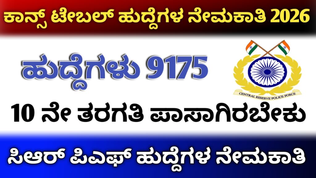 CRPF Constable Recruitment 2026 : ಸೆಂಟ್ರಲ್ ರಿಸರ್ವ್ ಪೊಲೀಸ್ ಫೋರ್ಸ್ ನಲ್ಲಿ ಅಗತ್ಯವಿರುವ ಕಾನ್ಸ್ಟೇಬಲ್ (ಟೆಕ್ನಿಕಲ್ ಮತ್ತು ಟ್ರೇಡ್ಸ್ಮೆನ್ ಮತ್ತು ಪಯೋನೀರ್) ಹುದ್ದೆಗಳ ಭರ್ತಿಗೆ ಅರ್ಹ ಹಾಗೂ ಆಸಕ್ತ ಅಭ್ಯರ್ಥಿಗಳಿಂದ ಅರ್ಜಿಗಳನ್ನು ಆಹ್ವಾನಿಸಲಾಗಿದೆ. ಹುದ್ದೆಗಳ ಭರ್ತಿಗೆ ಸಂಬಂಧಿಸಿದಂತೆ ಹುದ್ದೆಗಳ ಸಂಖ್ಯೆ, ಕರ್ತವ್ಯ ಸ್ಥಳ, ಶೈಕ್ಷಣಿಕ ಅರ್ಹತೆ, ವೇತನ, ಆಯ್ಕೆ ವಿಧಾನ ಹಾಗೂ ಇತರೆ ಮಾಹಿತಿಯನ್ನು ಈ ಕೆಳಗಡೆ ವಿವರವಾಗಿ ನೀಡಲಾಗಿದೆ ಪೂರ್ತಿ ಓದಿ.