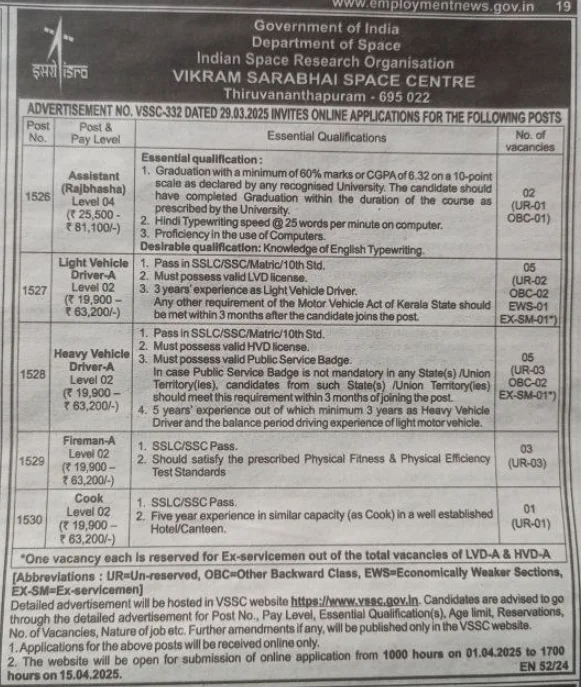 ISRO VSSC Recruitment 2025–ಭಾರತೀಯ ಅಂತರಿಕ್ಷ ಸಂಶೋಧನಾ ಸಂಸ್ಥೆ (ISRO), ವಿಕ್ರಂ ಸಾರಾಭಾಯಿ ಸ್ಪೇಸ್ ಸೆಂಟರ್ (VSSC), ಭಾರತ ಸರ್ಕಾರದ ಅಡಿಯಲ್ಲಿ ಅಸಿಸ್ಟೆಂಟ್, ಅಡುಗೆಗಾರ, ಅಗ್ನಿಶಾಮಕ, ಲಘು ಮತ್ತು ಭಾರಿ ವಾಹನ ಚಾಲಕ ಹುದ್ದೆಗಳ ನೇಮಕಾತಿಗೆ ಅಧಿಸೂಚನೆ ಬಿಡುಗಡೆ ಮಾಡಿದೆ. ಒಟ್ಟು 16 ಹುದ್ದೆಗಳು ಲಭ್ಯವಿದ್ದು, ಅರ್ಜಿ ಪ್ರಕ್ರಿಯೆ 2025 ಏಪ್ರಿಲ್ 1 ರಿಂದ ಪ್ರಾರಂಭವಾಗಿ, ಕೊನೆಯ ದಿನಾಂಕ ಏಪ್ರಿಲ್ 15, 2025 ಆಗಿರುತ್ತದೆ. ಅರ್ಹ ಅಭ್ಯರ್ಥಿಗಳು ಅಧಿಕೃತ ವೆಬ್ಸೈಟ್ www.vssc.gov.in ಮೂಲಕ ಆನ್ಲೈನ್ನಲ್ಲಿ ಅರ್ಜಿ ಸಲ್ಲಿಸಬಹುದು. ಆಸಕ್ತ ಮತ್ತು ಅರ್ಹ ಅಭ್ಯರ್ಥಿಗಳು ಸದರಿ ಹುದ್ದೆಗಳಿಗೆ ಅರ್ಜಿ ಸಲ್ಲಿಸಲು ನಿಗದಿಪಡಿಸಿದ ದಿನಾಂಕದೊಳಗೆ ಅರ್ಜಿ ಸಲ್ಲಿಸಿ , ಈ ಹುದ್ದೆಗಳಿಗೆ ಅಗತ್ಯವಿರುವ ವಿದ್ಯಾರ್ಹತೆ,(Qualification) ವೇತನ ಶ್ರೇಣಿ, (Salary) ವಯೋಮಿತಿ, (Age Limit) ಅರ್ಜಿ ಶುಲ್ಕ,( Application Fees ) ಹುದ್ದೆಗಳ ವಿವರ, ಇತರೆ ಎಲ್ಲಾ ಮಾಹಿತಿ ಕೆಳಗೆ ವಿವರಿಸಲಾಗಿದೆ, ಅಭ್ಯರ್ಥಿಗಳು ಅರ್ಜಿ ಸಲ್ಲಿಸುವ ಮುನ್ನ ಅಧಿಸೂಚನೆ (Notification) ಓದಿ ನಂತರ ಅರ್ಜಿ ಸಲ್ಲಿಸಿ.