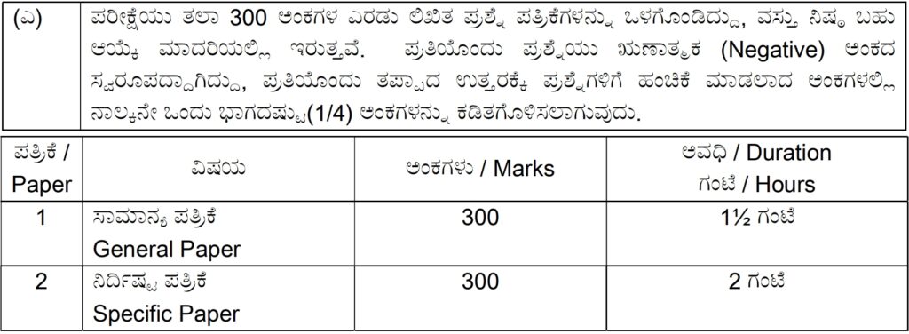 ಸೂಚನೆ – ಕೃಷಿ ಅಧಿಕಾರಿ ಮತ್ತು ಸಹಾಯಕ ಕೃಷಿ ಅಧಿಕಾರಿ (ಶೇ.85ರಷ್ಟು) ಹುದ್ದೆಗಳಿಗೆ ಒಂದು ಹಾಗೂ ಕೃಷಿ ಅಧಿಕಾರಿ ಮತ್ತು ಸಹಾಯಕ ಕೃಷಿ ಅಧಿಕಾರಿ (ಶೇ.15ರಷ್ಟು) ಹುದ್ದೆಗಳಿಗೆ ಒಂದು ನಿರ್ದಿಷ್ಟ ಪತ್ರಿಕೆಯ ಪರೀಕ್ಷೆಯನ್ನು ಹಾಗೂ ಮೇಲ್ಕಂಡ ಎಲ್ಲಾ ಹುದ್ದೆಗಳಿಗೆ ಒಂದೇ ಕನ್ನಡ ಭಾಷಾ ಪರೀಕ್ಷೆ ಮತ್ತು ಸಾಮಾನ್ಯ ಪತ್ರಿಕೆಯ ಪರೀಕ್ಷೆಗಳನ್ನು ನಡೆಸಲಾಗುವುದು.